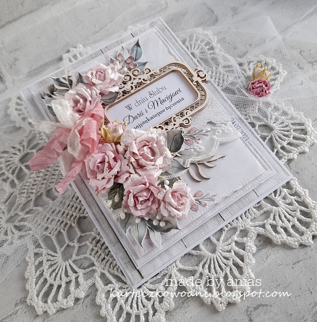 Ale był mały wyjątek - w ubiegłym tygodniu poczyniłam ślubną kartę dla Darii i Macieja. Ponieważ ślub jest właśnie dzisiaj- to mogę Wam pracę pokazać.